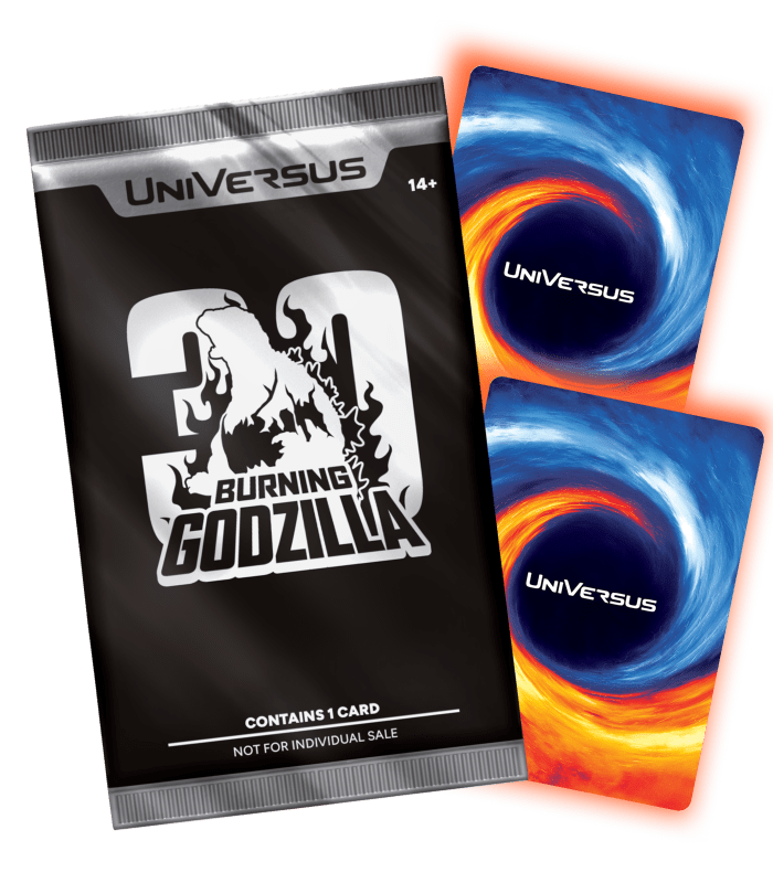 To celebrate Godzilla Day and the historic 30th anniversary of GODZILLA VS. DESTOROYAH, we’re teaming up with UniVersus to give away EXCLUSIVE Burning Godzilla promo cards on November 3rd. Each order that’s $150 or more (excluding taxes and shipping) will receive a Burning Godzilla promo pack containing one of two exclusive Burning Godzilla promo cards from UniVersus.