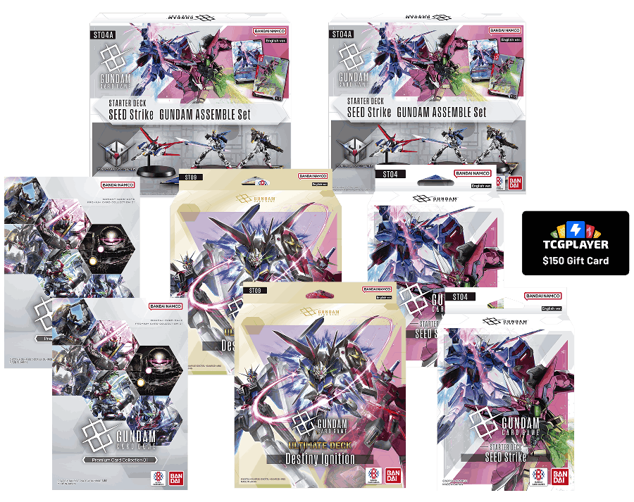 • Two (2) Gundam Destiny Ignition ST09 Ultimate Decks • Two (2) Gundam SEED Strike ST04 Starter Decks • Two (2) Gundam SEED Strike ST04A Special Edition Starter Decks • Two (2) GUNDAM CARD GAME Premium Card Collection [EVX05] • One (1) $150 TCGplayer Gift Card